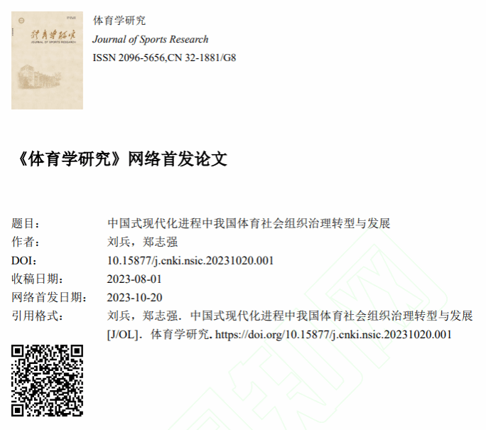 近日,国产亚洲精品美女久久久体育学院“体育学研究中心”刘兵教授团队受邀在体育学顶级期刊《体育学研究》(2023年影响因子6.0)上发表特稿“中国式现代化进程中我国体育社会组织治理转型与发展”研究论文。