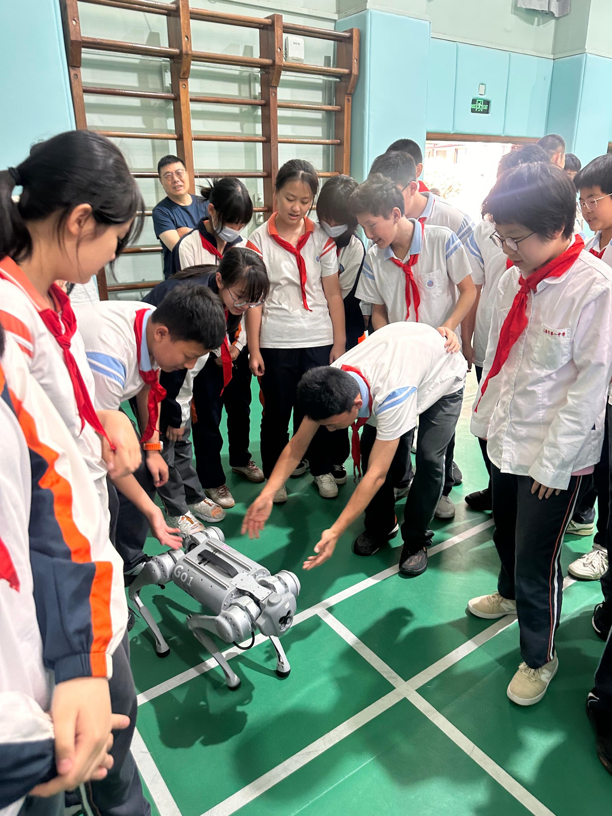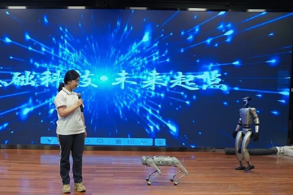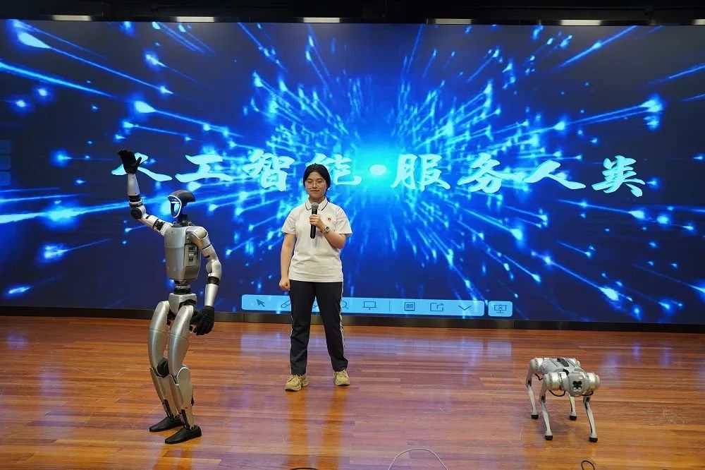 机器狗稳健攀爬楼梯至舞台中央,精准完成动态平衡演示及礼仪交互。这一技术已应用于工业巡检、应急救援等实体场景,充分展示了科技的实用性和价值。人形机器人的登场将整个科技节开幕式的气氛推向了高潮。它的仿生步态控制系统支持稳健完成单脚平衡、卧姿复位等复合指令,展现出了先进的科技水平。人形机器人不仅仅是一个机械装置,它代表着科技发展的前沿方向。在不久的将来,其认知计算与情感交互技术将推动人机共融,为我们的生活注入高效、安全与温情并存的科技力量。这让师生们对科技的未来充满了期待,也让大家深刻认识到科技的发展将给我们的生活带来巨大的改变。