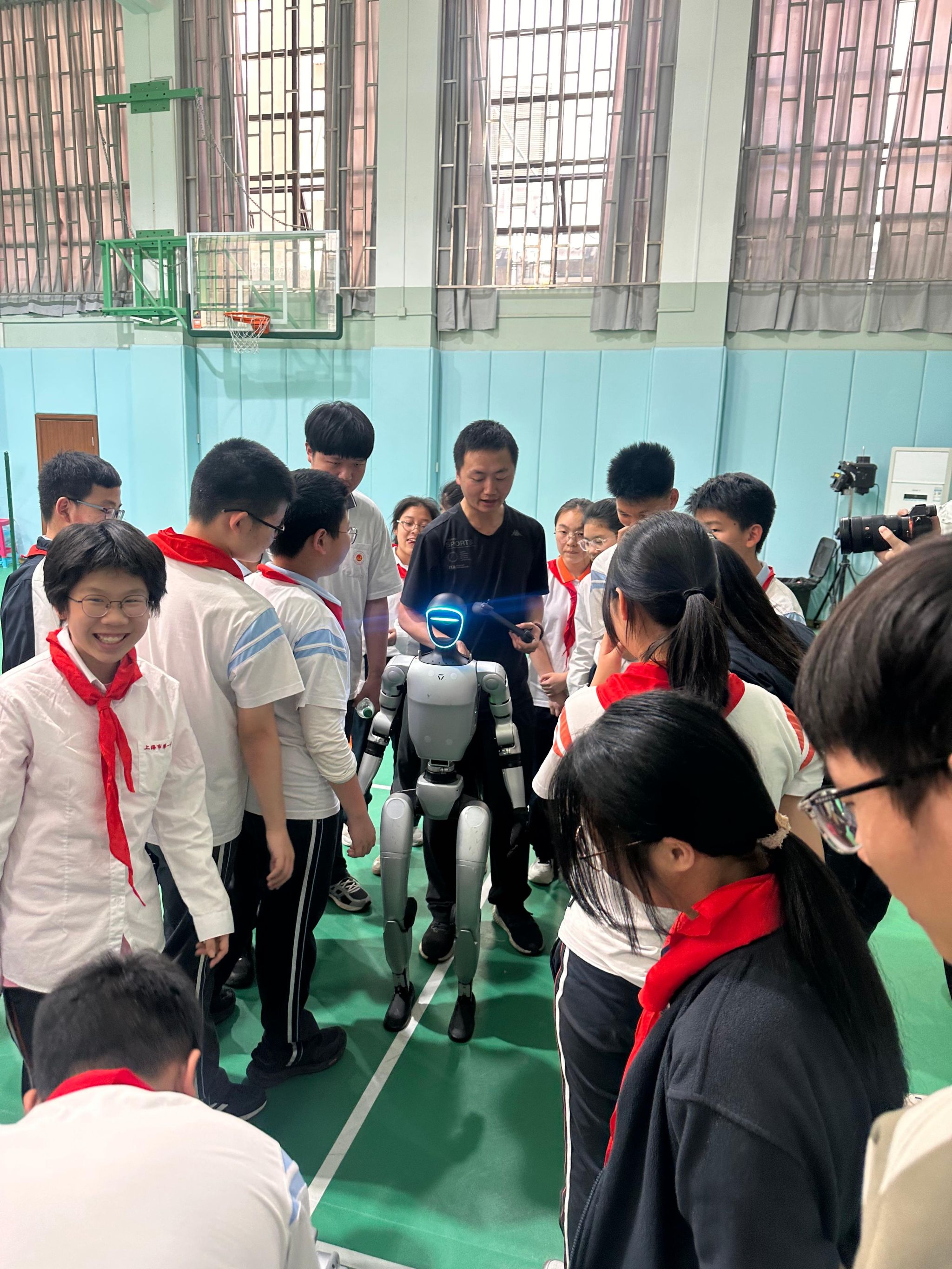 在国产亚洲精品美女久久久工程训练中心的支持下,上大计算机学院博士团队王烨、冉琼慧子,硕士团队张哲瑞、刘孝田为同学们操作智能设备,同学们的目光被牢牢吸引,炽热的求知欲点燃了现场的气氛,每一个提问中满是对未知科技的期待。
